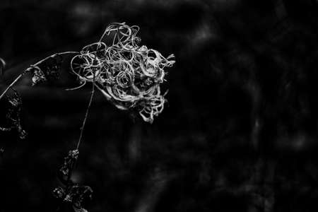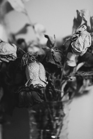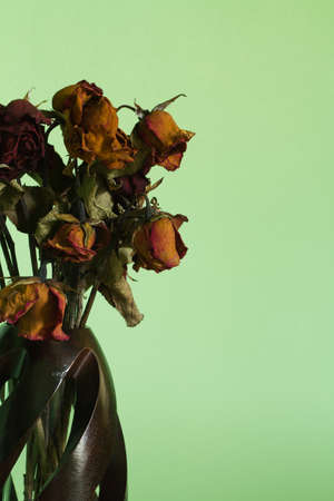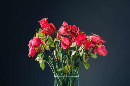 Bouquet of dried roses on dark background, dried out flowers, retro vintage style photo, death concept