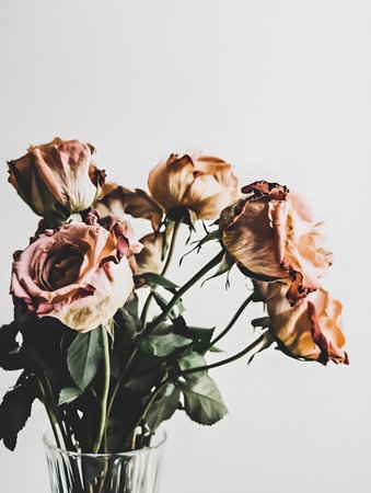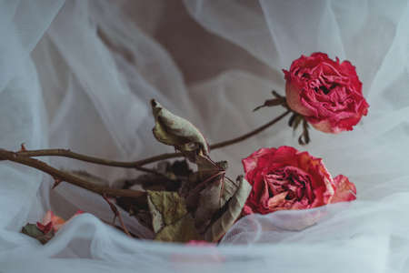 Beautiful vintage wilted roses on a rustic background. Faded wedding flowers.