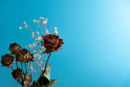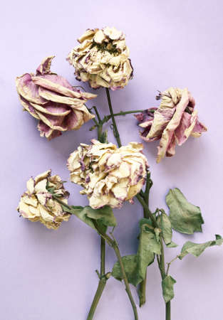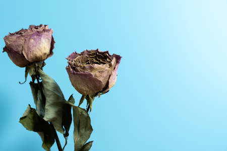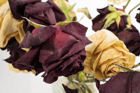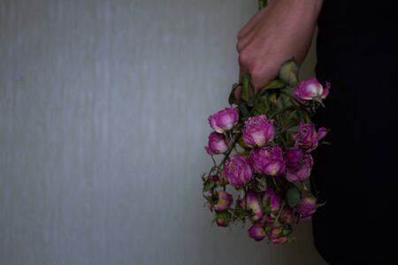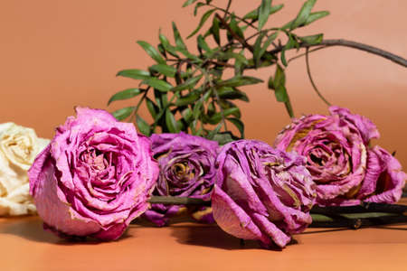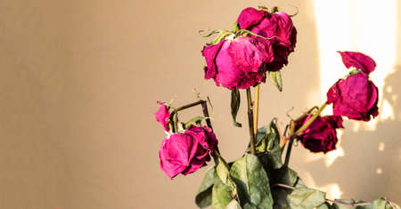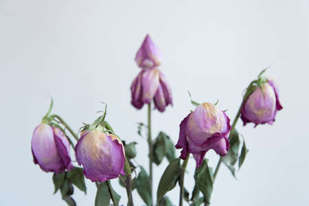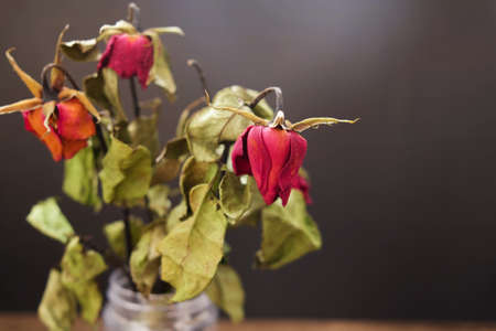 Withered withered dry dead roses bouquet close-up. One of the buds is held straight. The rest of the heads of the flowers down. Concept. The optimism and strength of spirit.