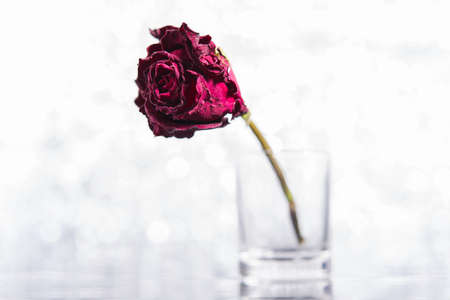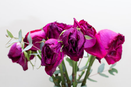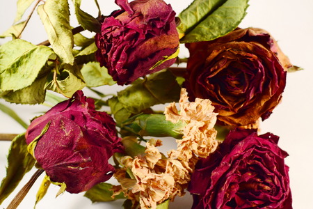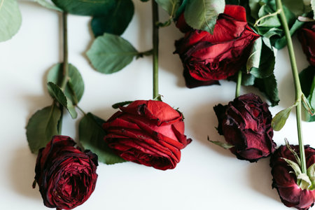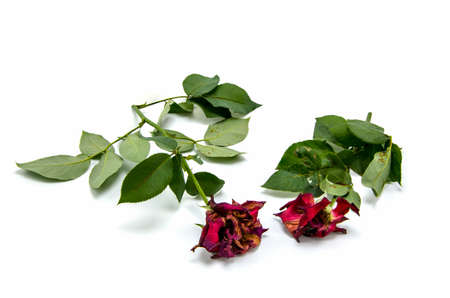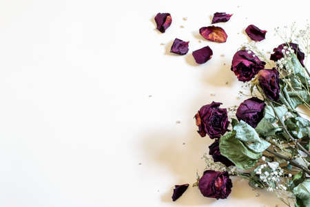 Withered red roses on a white background top view with place for text. Template, blank, card for design for St. Valentine's Day. Dead flowers as a symbol of broken love.