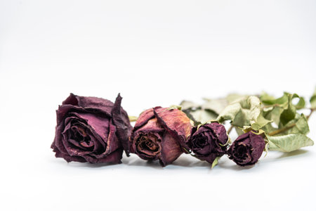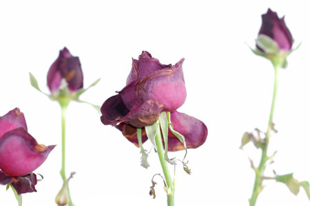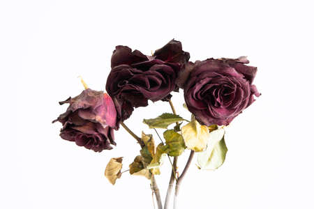3 stems of dried out dead red roses close up frontal shot isolated on white 2020