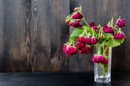Beautiful listless roses with leaves in a glass on a dark wood background. Great wood background with dry roses and copy space.