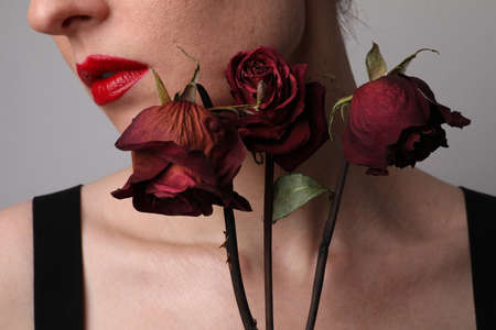 Cropped portrait of woman with red lips and dry roses posing on whitewall.