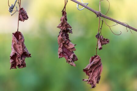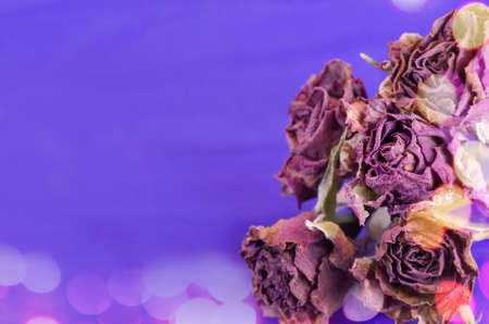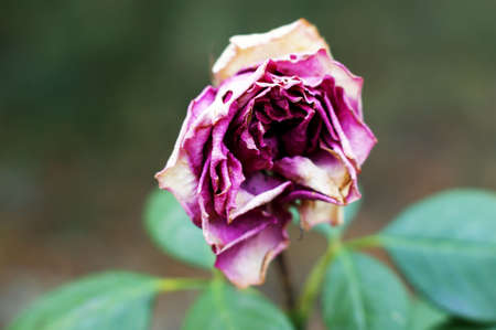 Withers away purple rose buds in the garden. Natural Botanical background with beautiful blossom, soft bokeh green color blurred. Plant care Caring for dry dying flowers.