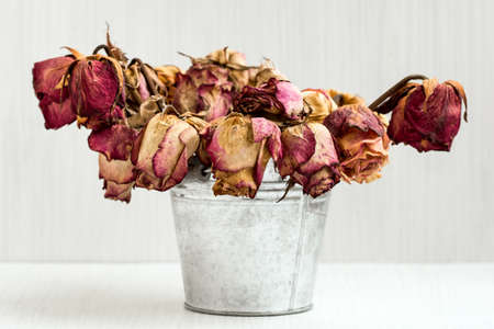 A bouquet of dead withered roses in old shabby aluminium bucket