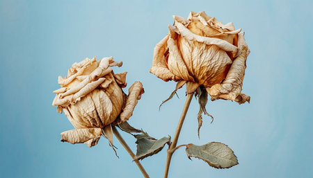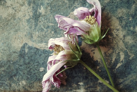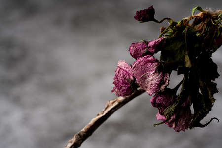 Fading flowers against a gray background. Three dried roses. copyspace. selective focus.