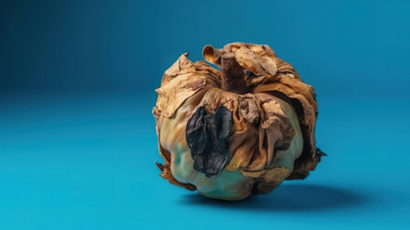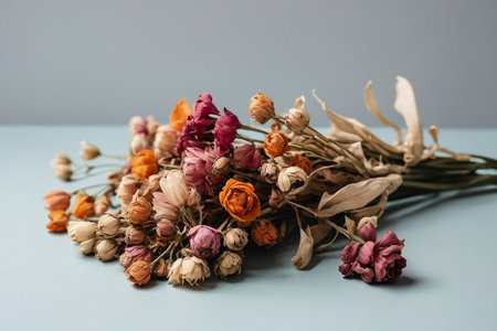 An AI generated illustration of a table with a dead bouquet of flowers and scattered petals