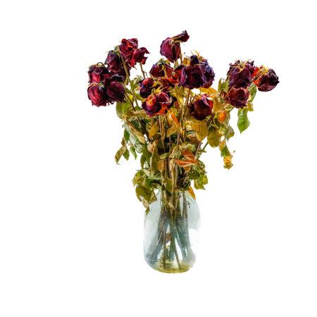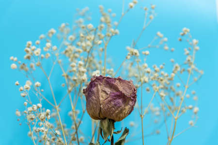 Bouquet of dry red roses and white gypsofila on white background, seasonal dry flowers for any design purposes.