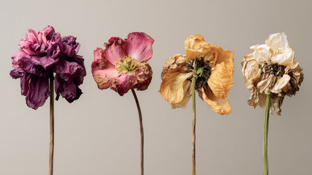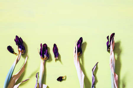 four dried tulips cast a shadow on the yellow surface. dead flowers