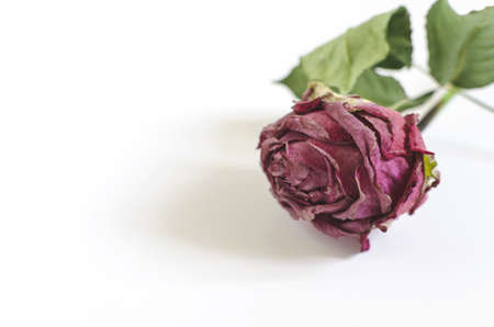 close up of a faded flower rose with leaves on a white background sharpness in the foreground