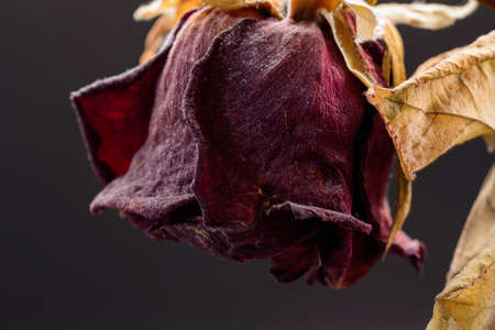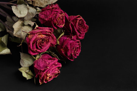 Dry pink roses on a black background. Dead roses close up, copy space. The concept of loneliness, age, sadness, old age, unhappy love, loss.