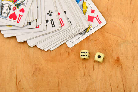 Playing cards and dice on a wooden table. Close-up, selective focus.