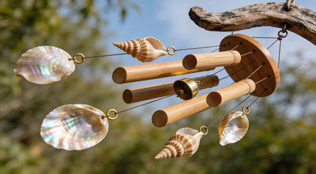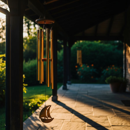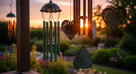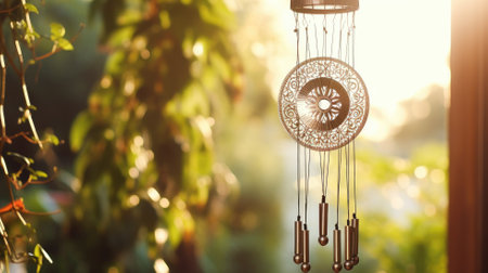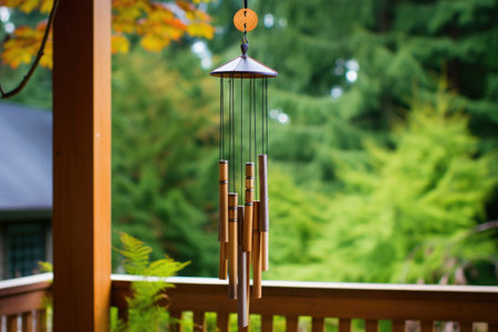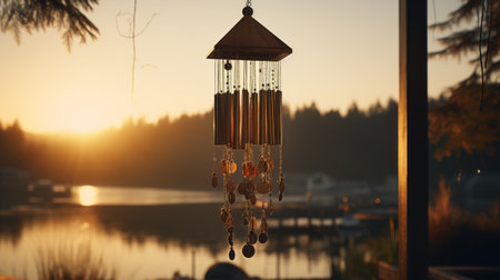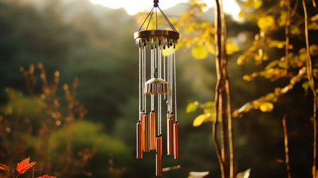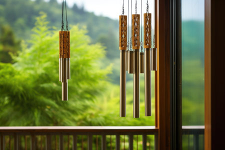 elegant wind chimes hanging from a porch against a nature backdrop, created with generative ai