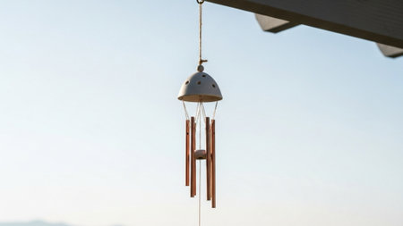Small decorative wind chime hanging against a pale blue sky. Cinematic wide shot (16:9) emphasizing