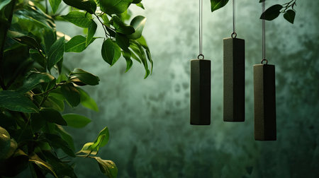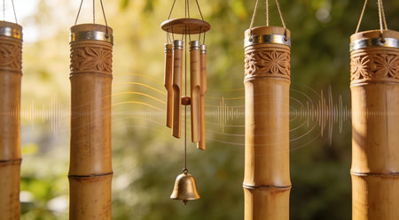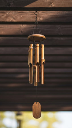 A gentle breeze whispers through a sun-dappled garden, creating a soft, melodic tune from a hanging bamboo wind chime. The tranquil sound and lush green bokeh background evoke a sense of peace, harmony, and mindful relaxation, perfect for wellness and spa concepts.