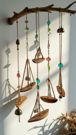 Rustic hanging mobile with wooden boats and colorful beads sunlit on white wall.