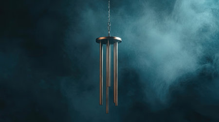 This captivating wind chime, suspended against a backdrop of smoke and light, creates a serene ambiance. The metallic structure offers a perfect blend of art and nature, perfect for peaceful spaces.