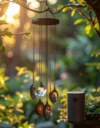 In the tranquil glow of the golden hour, a creative wind chime made of silver spoons gently sways, reflecting the last rays of sunlight.