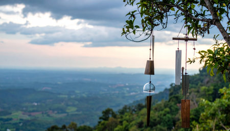 From a high mountain viewpoint, delicate wind chimes hang from a tree, offering a gentle sound against the vast, serene landscape below. The cloudy sky at dusk creates a tranquil and contemplative atmosphere, perfect for moments of peace, meditation, and mindfulness.