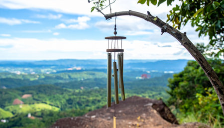 A gentle breeze whispers through a bamboo wind chime, creating a soft, melodic sound that drifts over a vast, lush green valley. This peaceful scene from a high viewpoint invites a moment of calm contemplation, mindfulness, and connection with natures tranquil beauty.