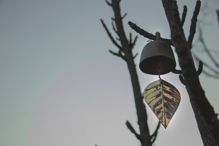 Minimal metal wind bell with leaf ornament hanging on tree branches against soft sky, calm zen atmosphere and peaceful outdoor mood.