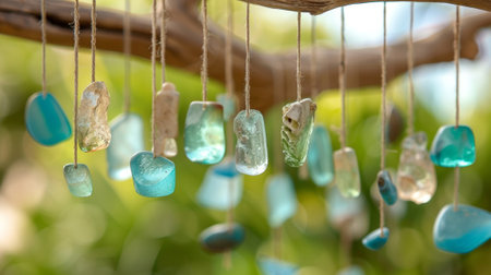 This serene image features hanging decorative elements amidst lush greenery, creating a tranquil atmosphere ideal for relaxation and interior design inspiration.
