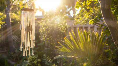 Bamboo wind chimes gracefully hanging outdoors amidst lush greenery and sunlight filtering through
