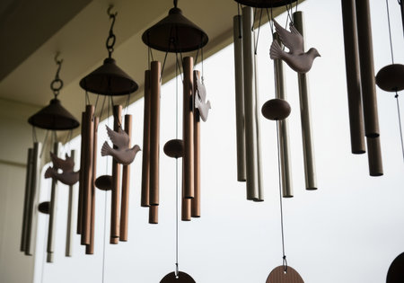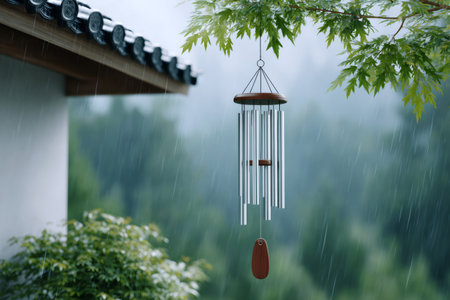 Wind chime creating peaceful ambiance with calming sounds on a rainy day