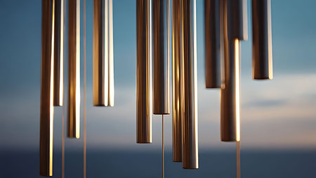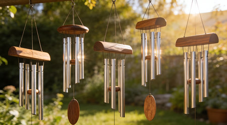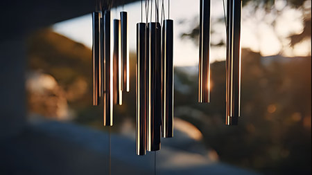 Metallic wind chimes hanging in a gentle breeze, reflecting sunlight onto nearby surfaces