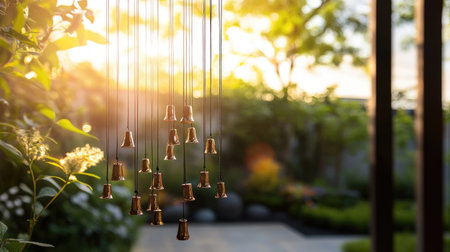 A charming outdoor scene with a set of wind chimes made from bells, gently swaying in the breeze against a backdrop of a sunny garden or patio.