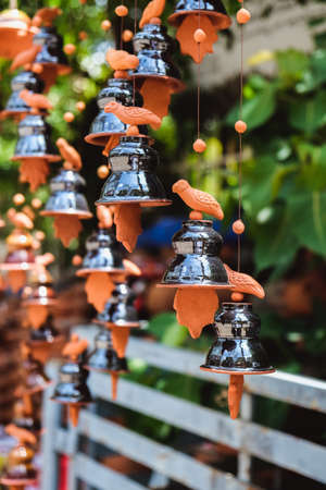Closeup brass wind chimes in the garden