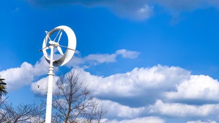 Horizontal axis wind turbine with blue sky and white clouds near green tree. Wind energy in eco wind farm. Green energy concept. Renewal energy. Alternative electricity source. Sustainable resources.