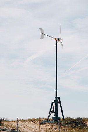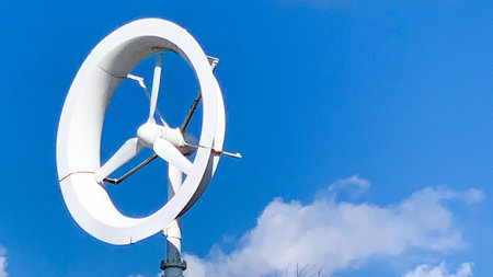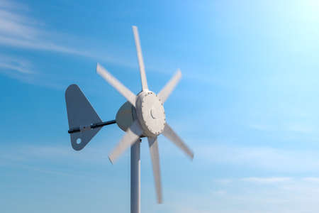 White wind turbine for alternative energy in day with blue sky background, electric clean power concept