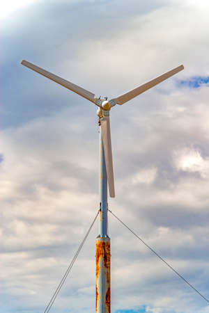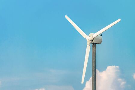 Wind turbine on blue sky background with white clouds. Alternative energy concept.