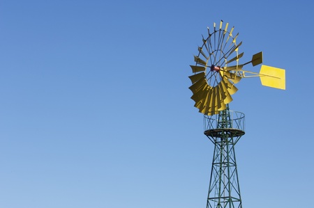 A close-up of an old-fashioned windmill on the prairies of Kansas. No people, copy space.