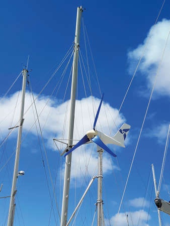 Wind Generator Turbine on Sailing Boat Moored in Harbour
