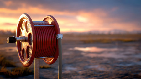 An attractively designed red hose reel with a coiled hose stands prominently against a stunning sunset backdrop. Perfect for outdoor enthusiasts.