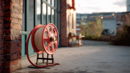 A vibrant red cable reel stands prominently on a paved surface, surrounded by a brick wall and glass windows, highlighting industrial design in an urban environment.