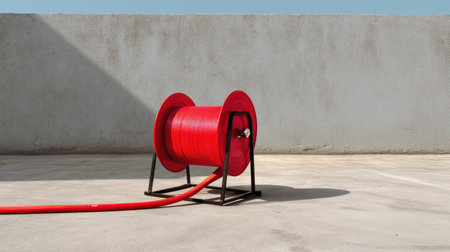A vibrant red hose reel stands prominently against a plain concrete wall, showcasing a blend of modern design and utility in a minimalist urban environment.