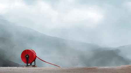 A vibrant red hose reel stands prominently against a foggy mountain landscape, showcasing a serene and peaceful atmosphere in nature