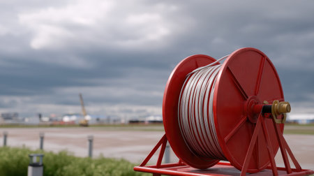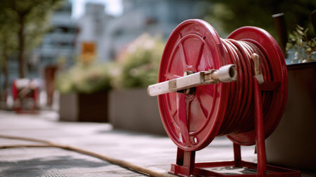 Close-up of a vibrant red fire hose reel in an urban environment, with a misty atmosphere enhancing the scene's urgency and safety context.