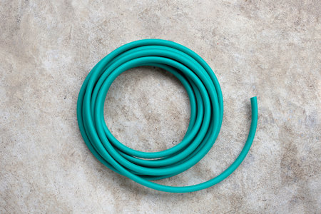 Green garden hose on cement floor background.