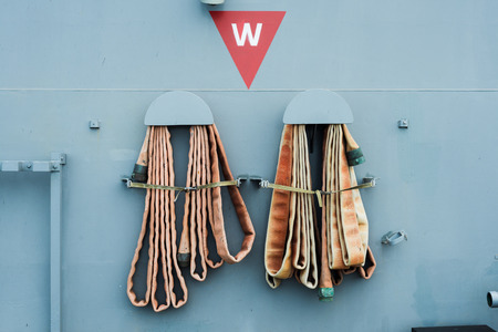 Fire fighter hose rolled up and ready for action. Close-up.