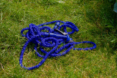 A blue watering hose made of a material that increases in length lies on the lawn in the garden