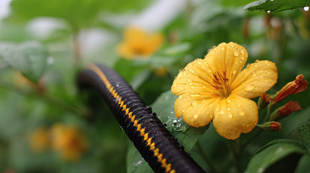 Close-up of a garden irrigation hose snaking through lush green plants adorned with yellow, pink, and white flowers. Sunlight enhances the natural setting.