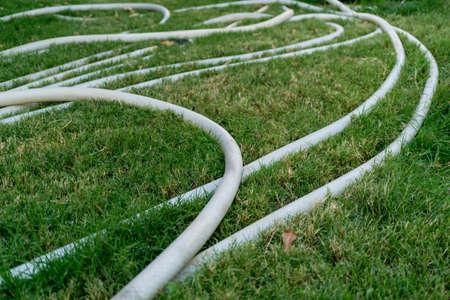 Long white plastic hose lies on the grass in the garden