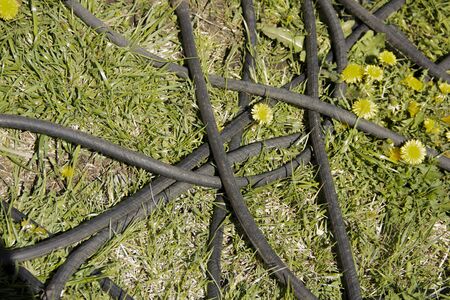 Black garden hose is lying on the grass. Dandelions grow next to the hose. Excellent background.