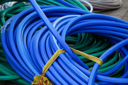A high angle shot of pile of blue, green and grey plastic hoses in a yard