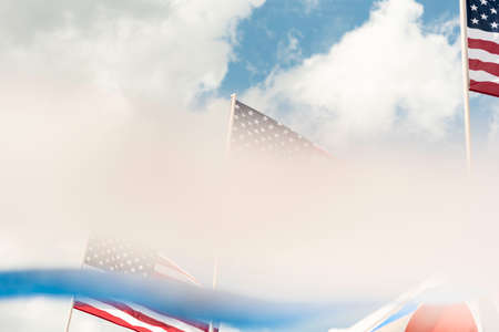 The national flag of the United States of America waving in the wind. Clear sky in the background. Selective focus. Democracy, independence and election day. Patriotic symbol of American pride