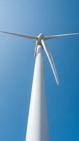 Cinematic low-angle view of a massive white wind turbine against a bright blue sky, symbolizing sustainable green energy and vital future business infrastructure.